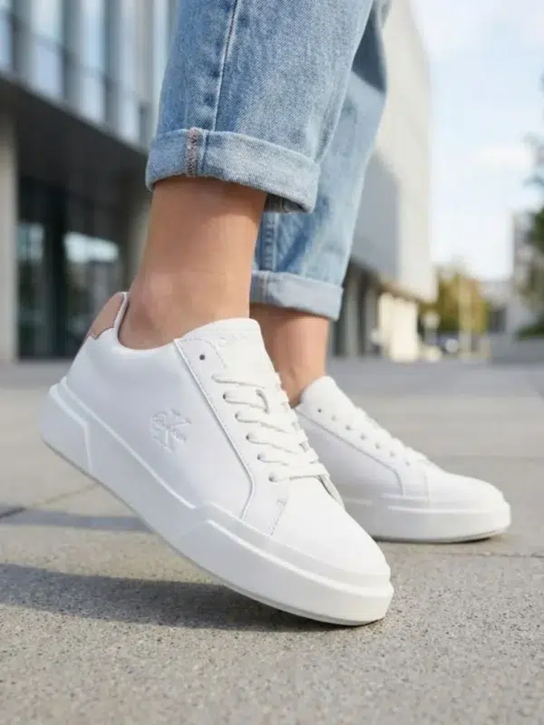 סניקרס עור לבן ורוד בעיצוב נקי ומודרני מבית קלווין קליין, עם סוליית פלטפורמה עבה לנוחות וסטייל. מתאים לשילוב יומיומי עם לוק קז'ואל או אלגנטי, ועמיד לאורך זמן בזכות איכות החומרים הגבוהה.
